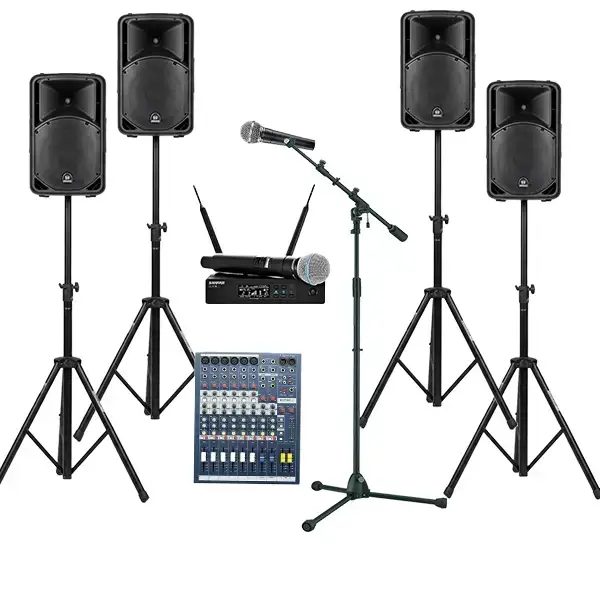 De presentatie set tot 200 personen is geschikt voor grote zalen, theaters, bioscopen en bedrijfshallen. Deze set kunt u ook zonder problemen buiten gebruiken, het geluid is zuiver en draagt erg ver. Voor al uw bedrijfspresentaties, lezingen, seminars, conferenties en borrels. De set bevat vier luidsprekers, een vaste microfoon, een draadloos microfoon, een mengpaneel met aansluiting voor laptop, telefoon of andere afspeel apparatuur. Wilt u een powerpoint, video of foto’s laten zien, dan is het aan te raden om een beamer met scherm bij deze set te huren. U kunt ook een geluidstechnicus bij ons huren om de installatie te bedienen tijdens uw evenement. Al onze presentatie sets installeren wij gratis voor u. Is deze set voor u te groot? Kijk naar presentatie set huren 100 personen. Nog andere wensen voor techniek? Neem contact met ons op.